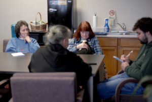 Sitting around the table is Jill Smith, the raccoon specialist who founded Trails End in 1986; “Skunk Julie” McLaughlin, who’s affiliated with Indiana Skunk Rescue; “Raccoon Julie” Burdine, the vice president of Trails End; and Jackie Cook, who specializes in possums.